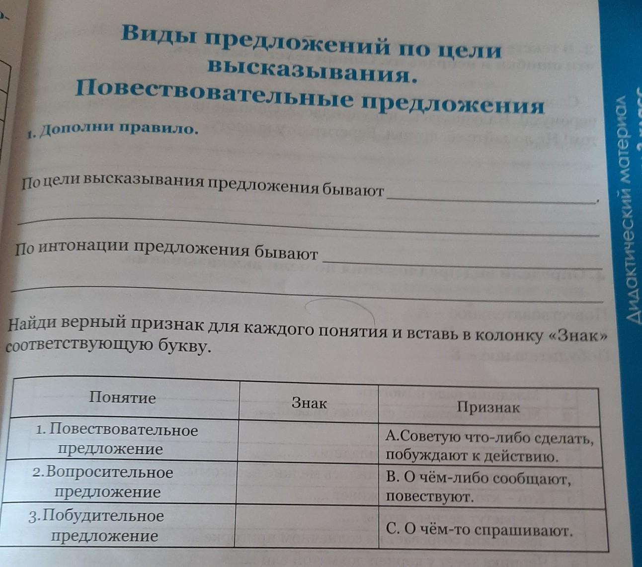 1) По цели высказывания: повествовательные, вопросительные побудительные
