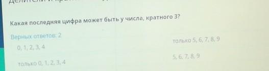 Какая последняя цифра может быть у числа, кратного 3? Верных ответов: 2 0, 1, 2, 3, 4 только 5, 6, 7, 8, 9 только 0, 1, 2, 3, 4 5, 6, 7, 8, 9