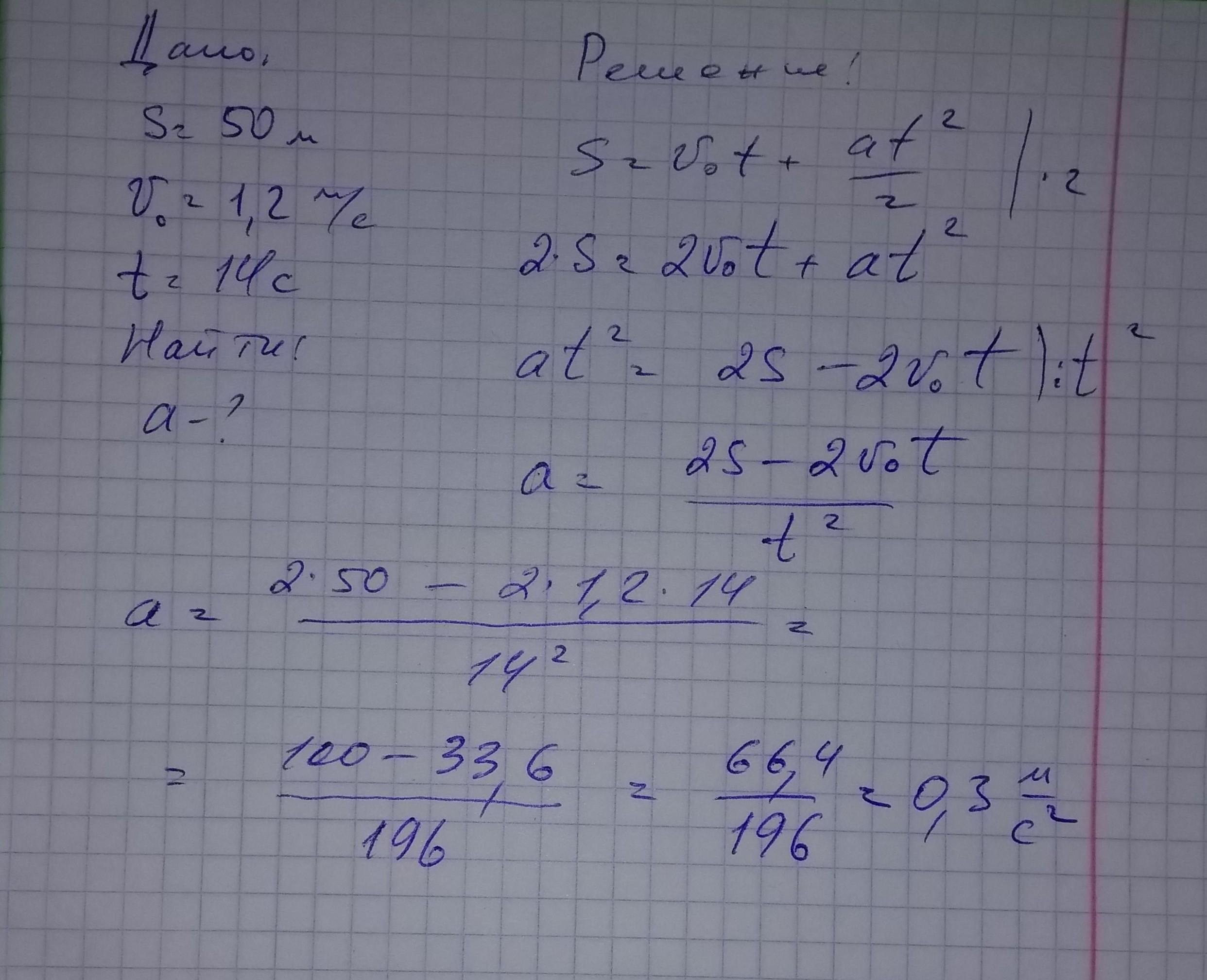 Лыжник спустился с горы длиной 50 м.С каким ускорением он спускался,если начальная скорость равна 1,2 м/с,а время спуска 14с?