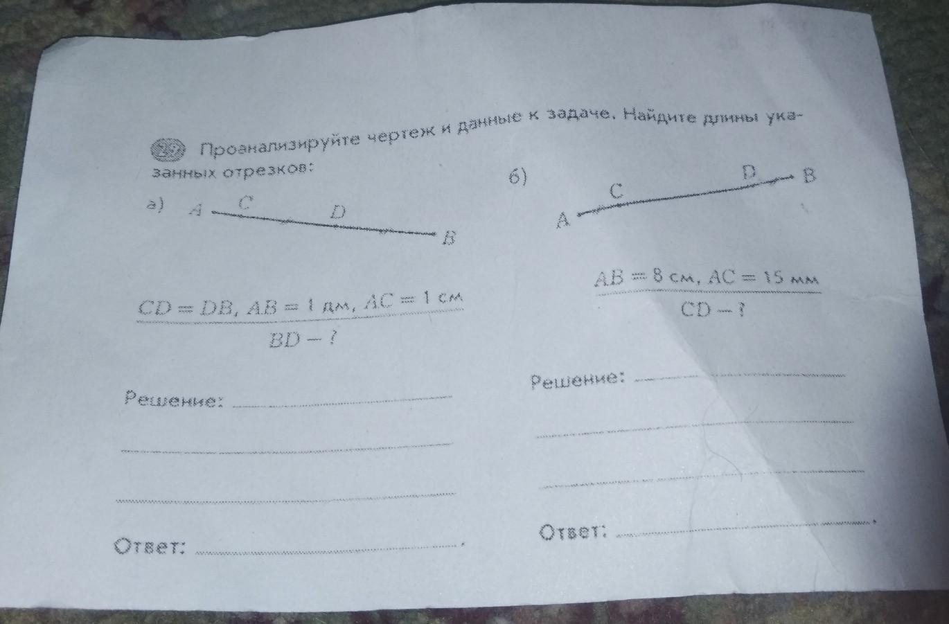 Проанализируйте чертеж и данные к задаче, Найдите умны ука- занных отрезков? D б) - в С A CD = DB, AB = 1, AC=1CM А.В 8 см, AC = 15 мм CD - ? B) - ? Решение: ответ: