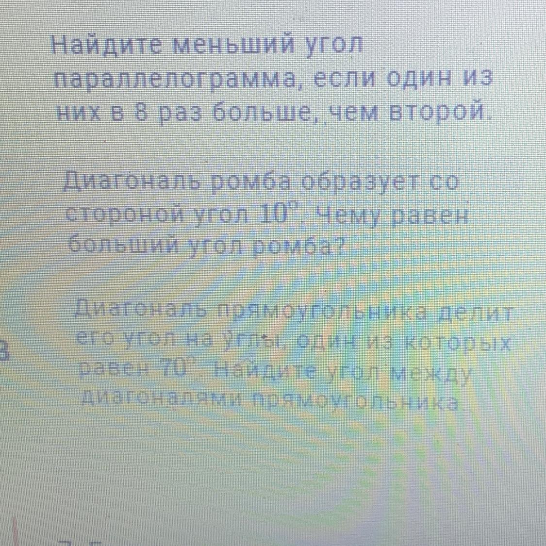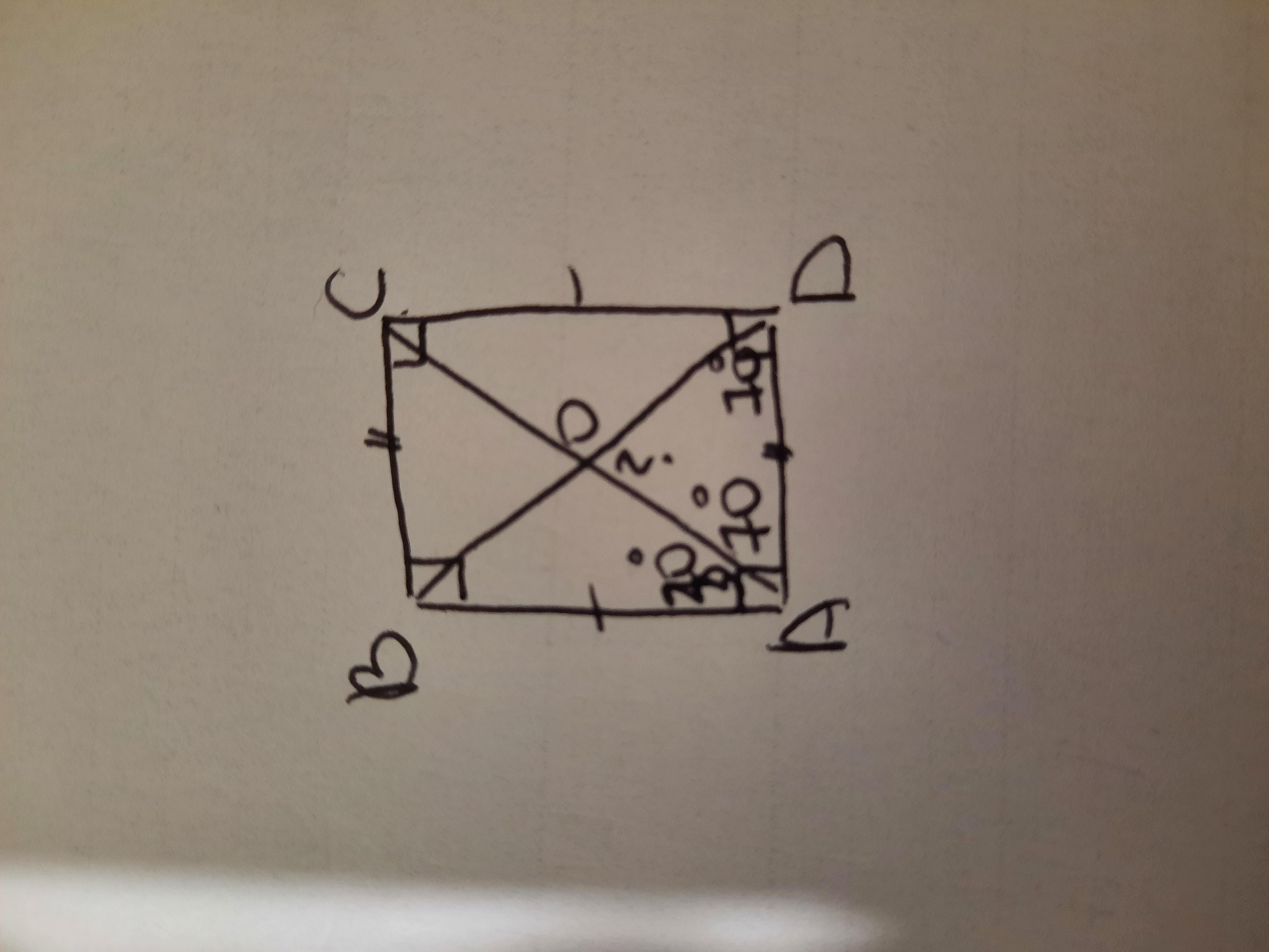 Прямоугольник АВСD, точка пересечения диагоналей О. Диагональ АС делит угол А на два угла ВАО (90° - 70° = 30°) и ОАD (70°).