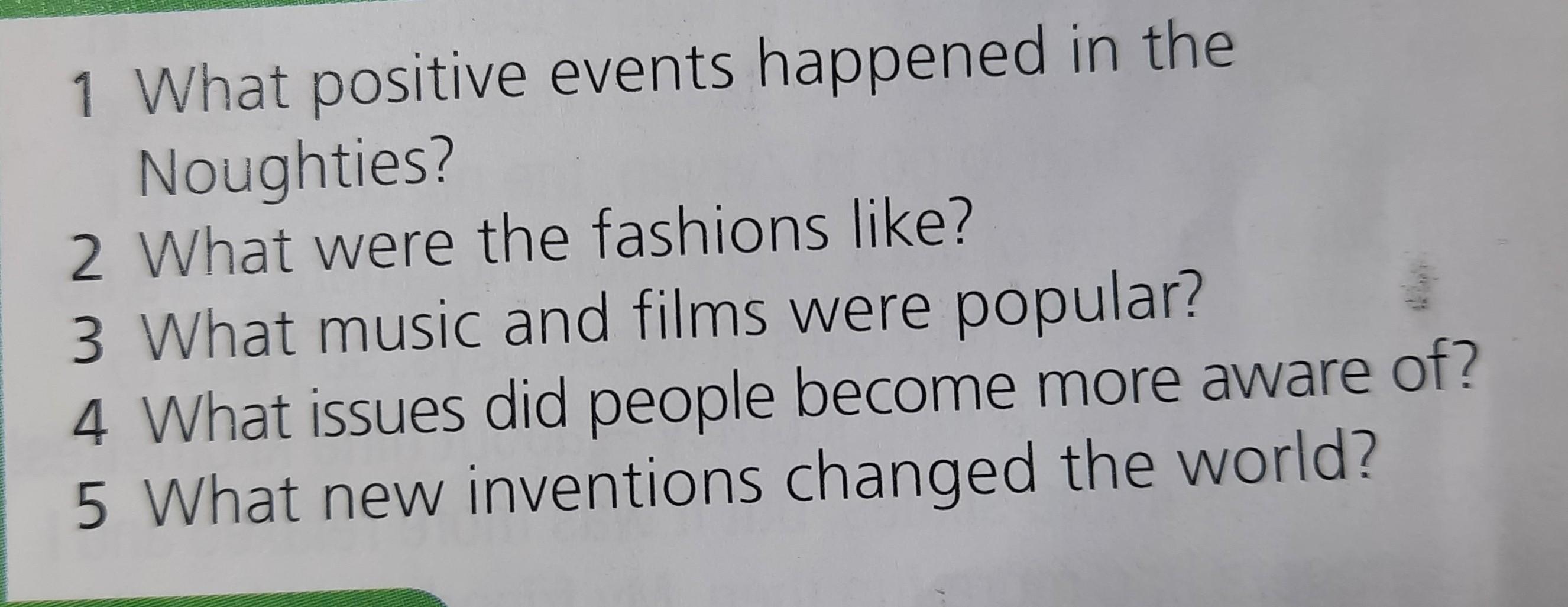 B THINK AND PLAN 1 What positive events happened in the Noughties? 2 What were the fashions like? 3 What music and films were popular? 4 What issues did people become more aware of? 5 What new inventions changed the world?