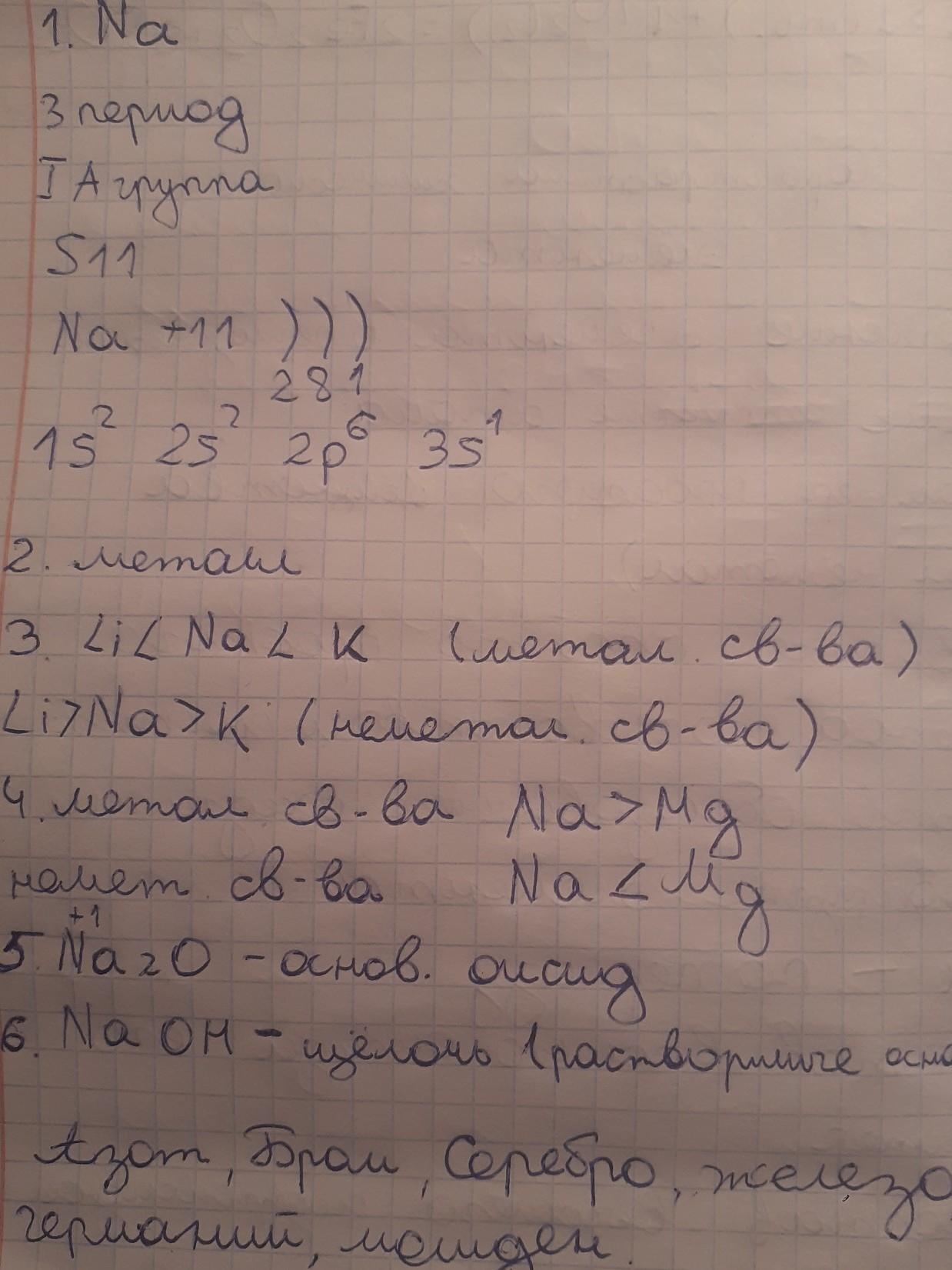 1. Натрий-это щелочной металл,который расположен в третьем периоде, в 1-группе и относится к элементам к главной подгруппе. Натрий имеет 11 протонов,11электронов и 12нейтронов.Натрий имеет следующее электронное строение: