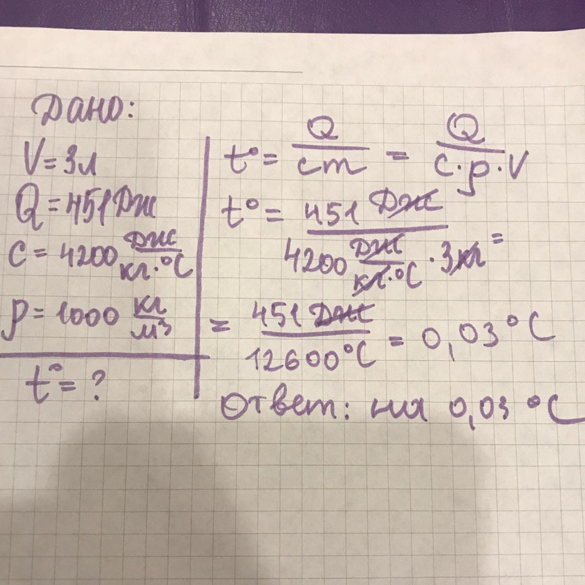 Определи, на сколько градусов нагреется вода объёмом 3 л, если ей сообщить количество теплоты, равное 451 Дж. Удельная теплоёмкость воды равна 4200 Дж/(кг·°C), плотность воды — 1000 кг/м³.