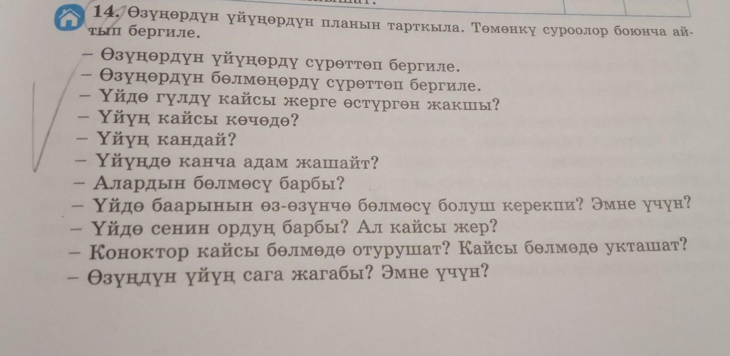 14. Өзүңөрдүн үйүңөрдүн планын тарткыла. Төмөнкү суроолор боюнча айтып бергиле