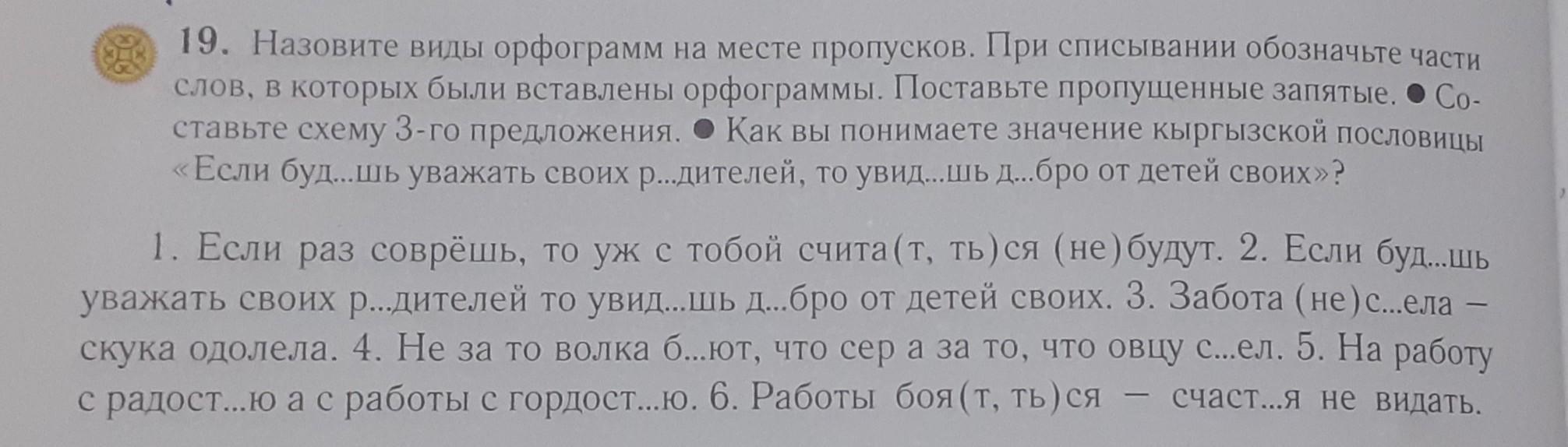 19. Назовите виды орфограмм на месте пропусков. При списывании обозначьте части слов, в которых были вставлены орфограммы. Поставьте пропущенные запятые. • Со- ставьте схему 3-го предложения. ОҚак вы понимаете значение кыргызской пословицы «Если буд...шь уважать своих р...дителей, то увид...шь д...бро от детей своих»? 1. Если раз соврёшь, то уж с тобой счита (т, ть) ся (не) будут. 2. Если буд..ШЬ уважать своих р...дителей то увид...шь д...бро от детей своих. 3. Забота (не)с..ела скука одолела. 4. Не за то волка б...ют, что сера за то, что овцу с..ел. 5. На работу с радост...юас работы с гордост...ю. 6. Работы боя (т, ть) ся счаст...Я не видать. -