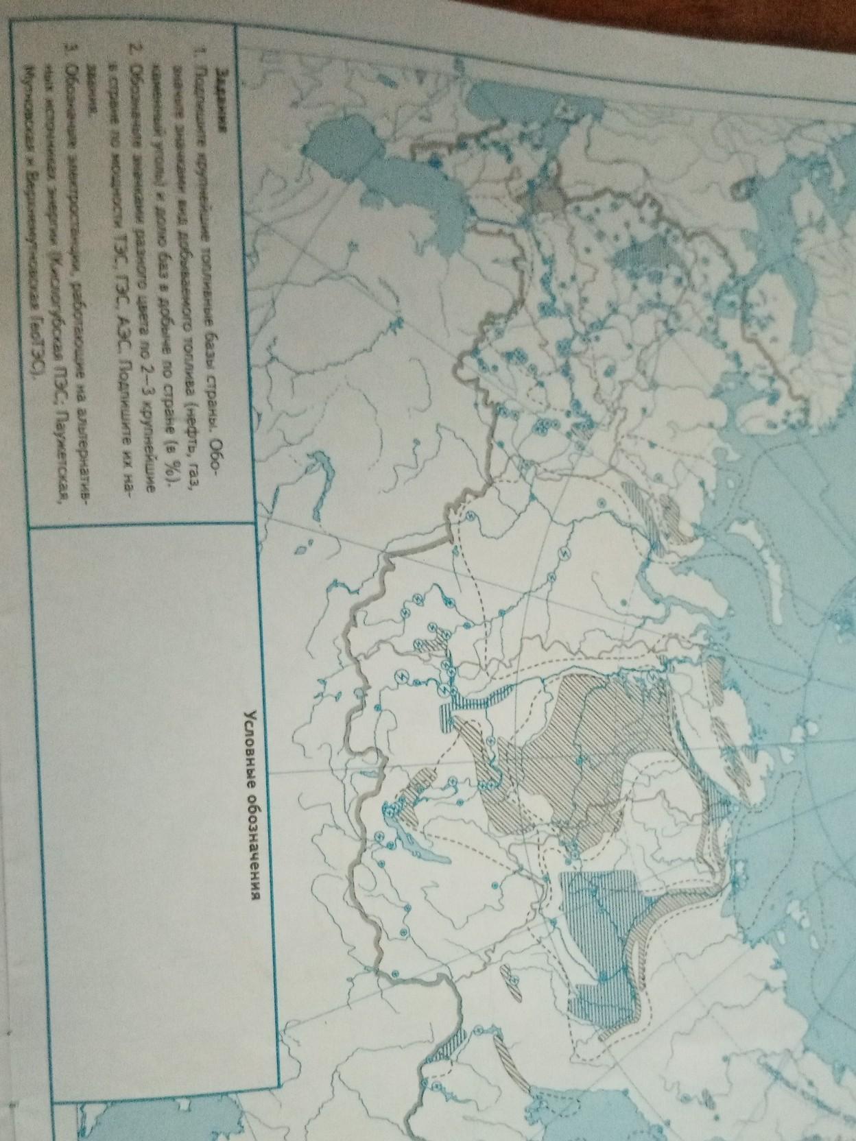 Задания 1. Подпишите крупнейшие топливные базы страны. Обо- значьте значками вид добываемого топлива (нефть, газ, каменный уголь) и долю баз в добыче по стране (в %). 2. Обозначьте значками разного цвета по 2-3 крупнейшие в стране по мощности ТЭС, ГЭС, АЭС. Подпишите их на- Звания. 3. Обозначьте электростанции, работающие на альтернатив- ных источниках энергии (Кислогубская ПЭС; Паужeтская, Мутновская и Верхнемутновская ГеоТЭС).