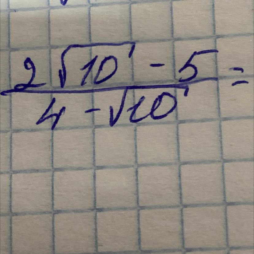\dfrac{2\sqrt{10}-5}{4-\sqrt{10}}=\dfrac{(2\sqrt{10}-5)(4+\sqrt{10})}{(4-\sqrt{10})(4+\sqrt{10})}=\dfrac{8\sqrt{10}+20-20-5\sqrt{10}}{4^{2}-(\sqrt{10})^{2}}=\dfrac{3\sqrt{10}}{16-10}=