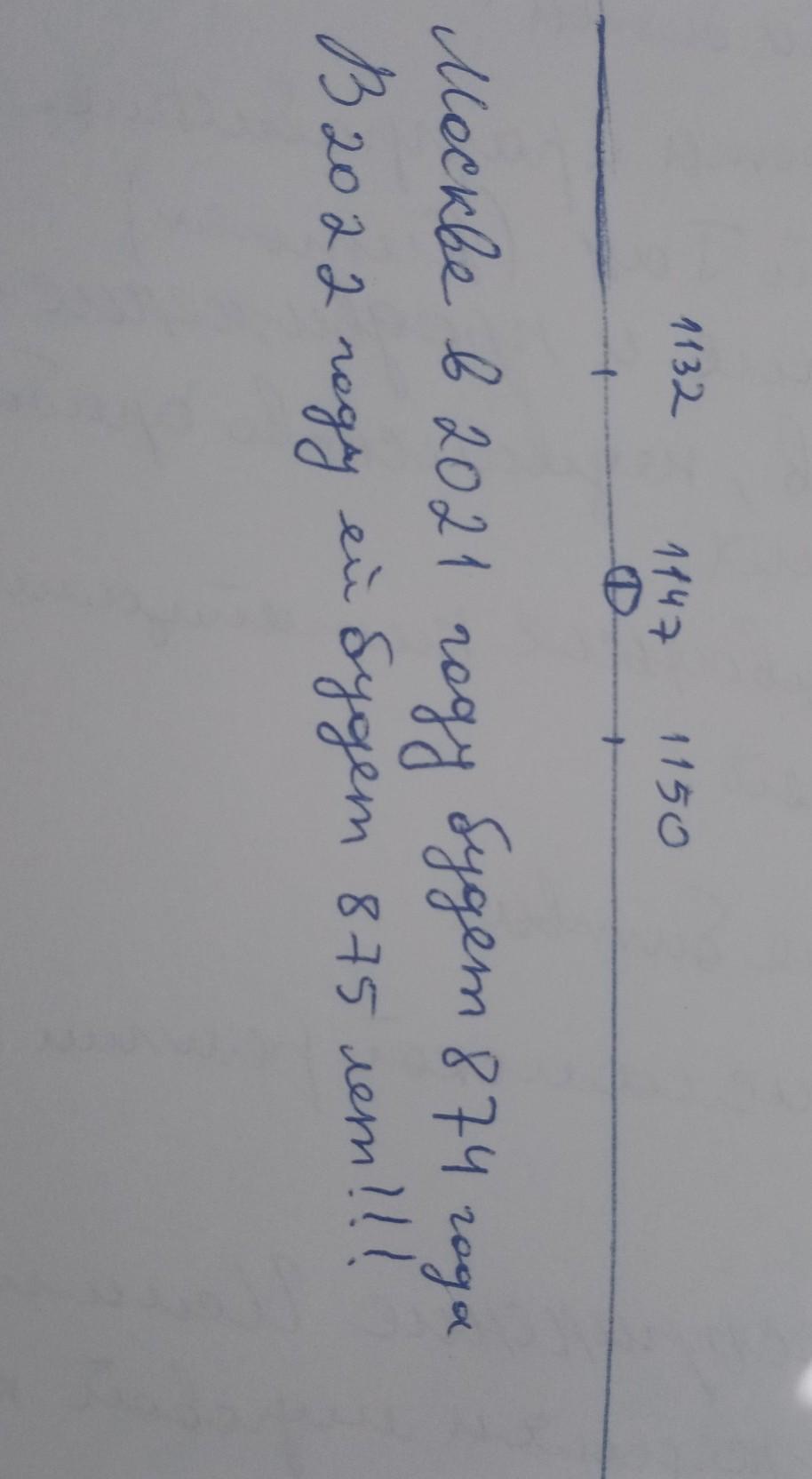 Первое упоминание в летописи о Москве относится к 1147 году. Отметьте на «линии времени» этот год. Под- считайте, сколько лет исполнилось Москве в нынешнем году (вычисления делайте письменно)