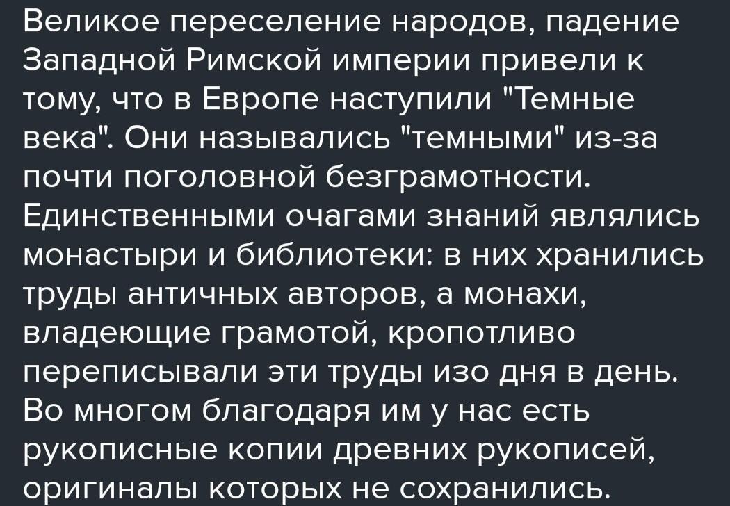 Великое переселение народов,падение Западной Римской империи привели к тому что в Европе наступили "Темные века".Они назывались "темными"из-за почти поголовной безграмотности.Единственными очагами знаний являлись монастыри и библиотеки:в них хранились труды античных авторов,а монахи,владеющие грамотой,кропотливо переписывали эти труды изо дня в день.Во много благодаря им у нас есть рукописей,оригиналы которых не сохранились.