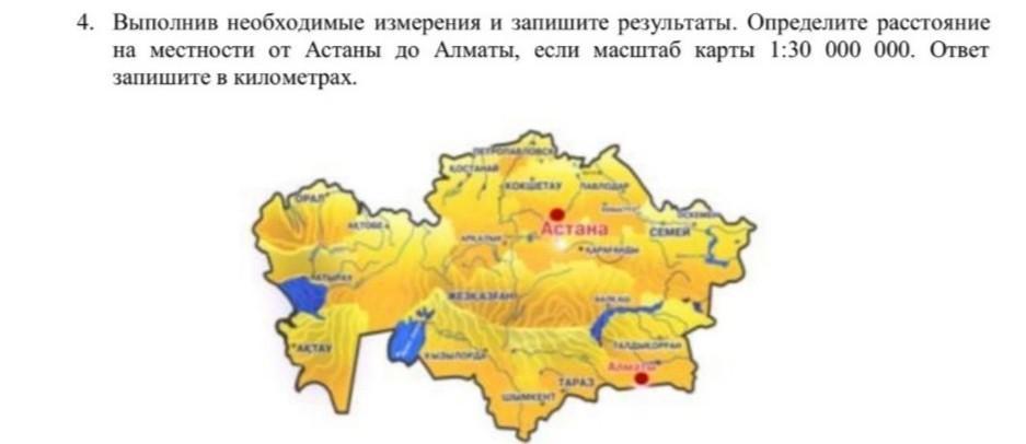 Померяй расстояние линейкой в сантиметрах. Тогда расстояние от Алматы до Астаны = S/100 000*30 000 000 км (s это расстояние на рисунке)