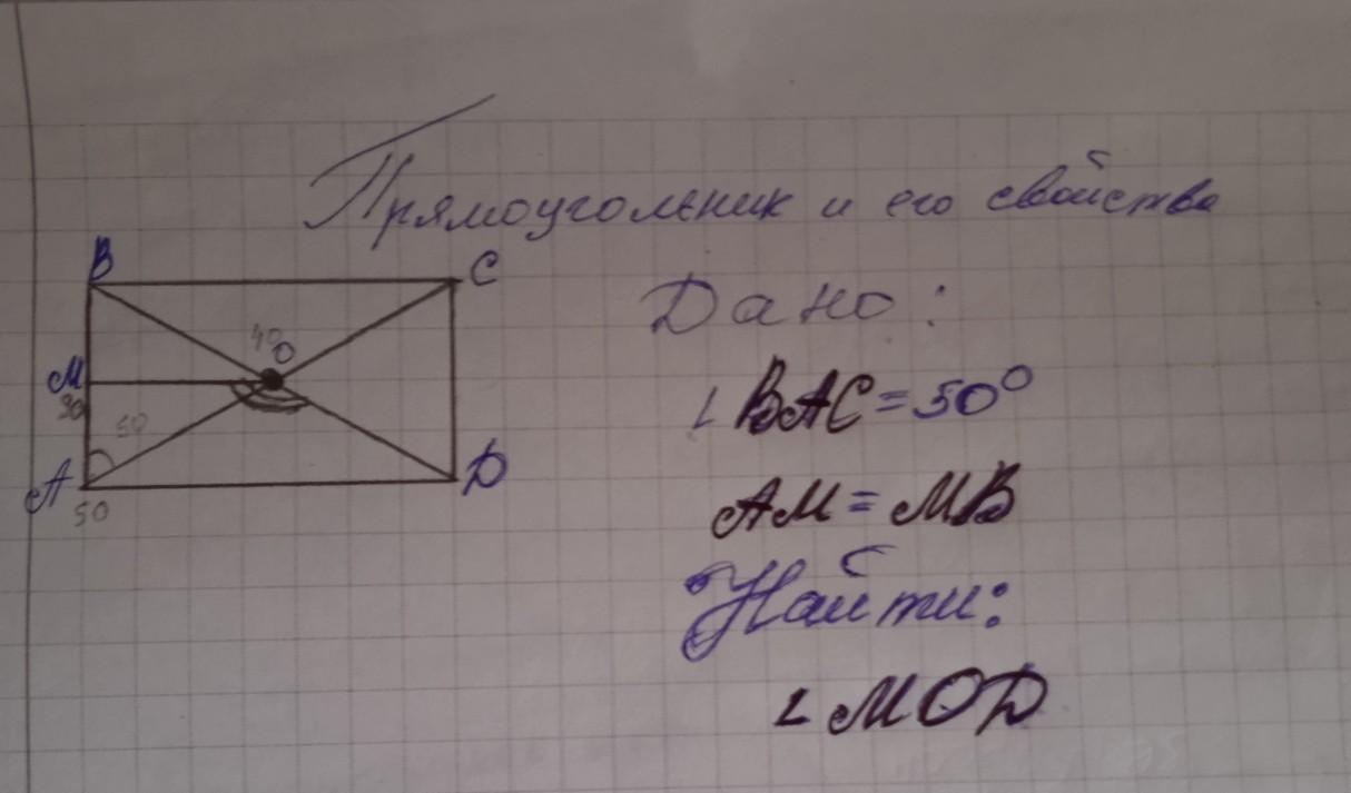 по свойству прямоугольника отрезки диагоналей равны между собой, значит AO=OD, т.е. треугольник AOD равнобедренный по определению. Значит, ODA=OAD=90-50=40, значит AOD=180-40*2=100 по сумме углов треугольника. ABO тоже равнобедренный по той же причине, значит медиана в нем по совместительству высота, т.е. OM перпендикулярен AB. Значит, по сумме углов треугольника AOM=180-90-50=40. MOD=AOD+AOM=140