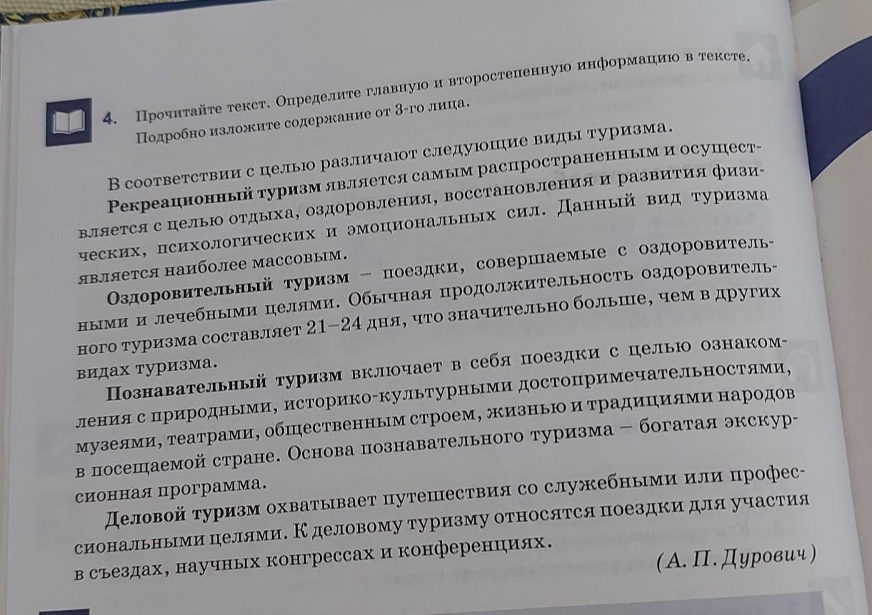 4. Прочитайте текст. Определите главную и второстепенную информацию в тексте. Подробно изложите содержание от 3-го лица. В соответствии с целью различают следующие виды туризма. Рекреационный туризм является самым распространенным и осущест- вляется с целью отдыха, оздоровления, восстановления и развития физи- ческих, психологических и эмоциональных сил. Данный вид туризма является наиболее массовым. Оздоровительный туризм поездки, совершаемые создоровитель- ными и лечебными целями. Обычная продолжительность оздоровитель- ного туризма составляет 21-24 дня, что значительно больше, чем в других видах туризма. Познавательный туризм включает в себя поездки с целью ознаком- ления с природными, историко-культурными достопримечательностями, музеями, театрами, общественным строем, жизнью и традициями народов в посещаемой стране. Основа познавательного туризма сионная программа. Деловой туризм охватывает путешествия со служебными или профес- сиональными целями. К деловому туризму относятся поездки для участия в съездах, научных конгрессах и конференциях. (А. П. Дурович) богатая экскур- ПЖПЖПЖПЖПЖЖПЖПЖПЖПЖПЖПЖПЮПЮПЮПЮПЮПЮПЮП ПОМОГИТЕ ДАМ 20 БАЛОВ