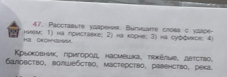 47. Расставьте ударения. Выпишите слова с ударе- нием: 1) на приставке; 2) на корне; 3) на суффиксе; 4) на окончании. Крыжовник, пригород, насмешка, тяжёлые, детство, баловство, волшебство, мастерство, равенство, река.