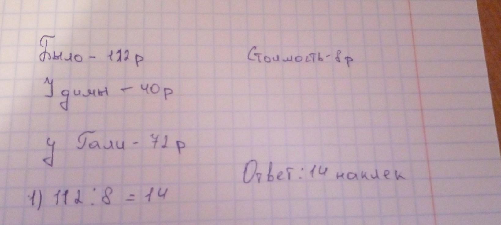+72=112).Потом мы должны 112 разделить на 8(112:8=14) и у нас получается 14.То есть Дима и Галя смогут купить 14 наклеек.