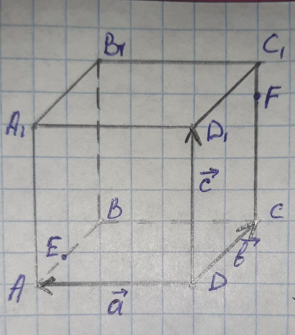 Три некомпланарных вектора a→, b→ и c→ размещены на рёбрах куба с общей вершиной. Точка E делит ребро AB так, что AE:EB=1:1, а точка F делит ребро CC1 так, что CF:FC1=3:2