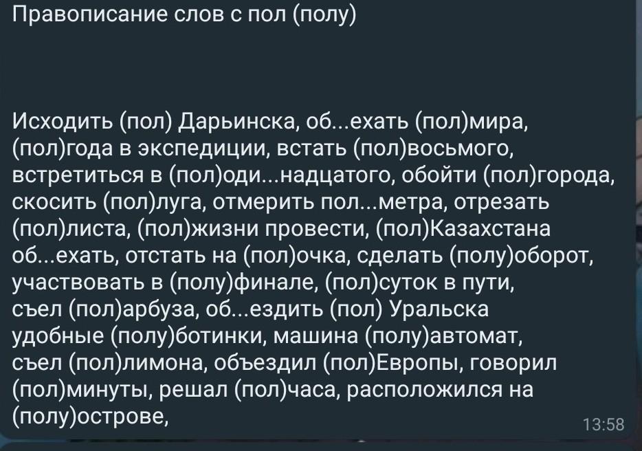 Исходить (пол)России, об...ехать (пол)мира, быть (пол)года в экспедици..., встать (пол)восьмого, обойти (пол)города, с...есть (пол)апельсина, скосить (пол)луга, отрезать (пол)метра ткани, откусить (пол)яблока, (пол)жизни провести в (пут…)шествиях, пройти (пол)Крыма, опоздать на (пол)минуты, возвратиться в (пол)одиннадцатого, отстать на (пол)очка, (полу)годичное отсутствие, сделать (полу)оборот, (полу)льняное волокно, участвовать в (полу)финале, пробежать (пол)дистанции, перегородить (пол)улицы, (Пол)ставки, (пол)Европы, (пол)часа, (полу)шёпот, (пол)арбуза, (пол)тысячи, (пол)стакана, (пол)граненого стакана, (пол)ложки, (пол)килограмма, (пол)литра, (полу)чистый, (пол)второго, (пол)цены, (пол)России, (полу)фабрикат, (пол)апельсина, (пол)лимона, (пол)эмалированного ведра, (полу)тон, (пол)года, (пол)миллиона, (полу)месяц, (пол)страницы, (пол)листа, (полу)грамотный, (полу)тяжёлый, (полу)финальный, (пол)большой тарелки, (пол)порции, (полу)разрушенный, (пол)очка, (пол)пути, (пол)смены.