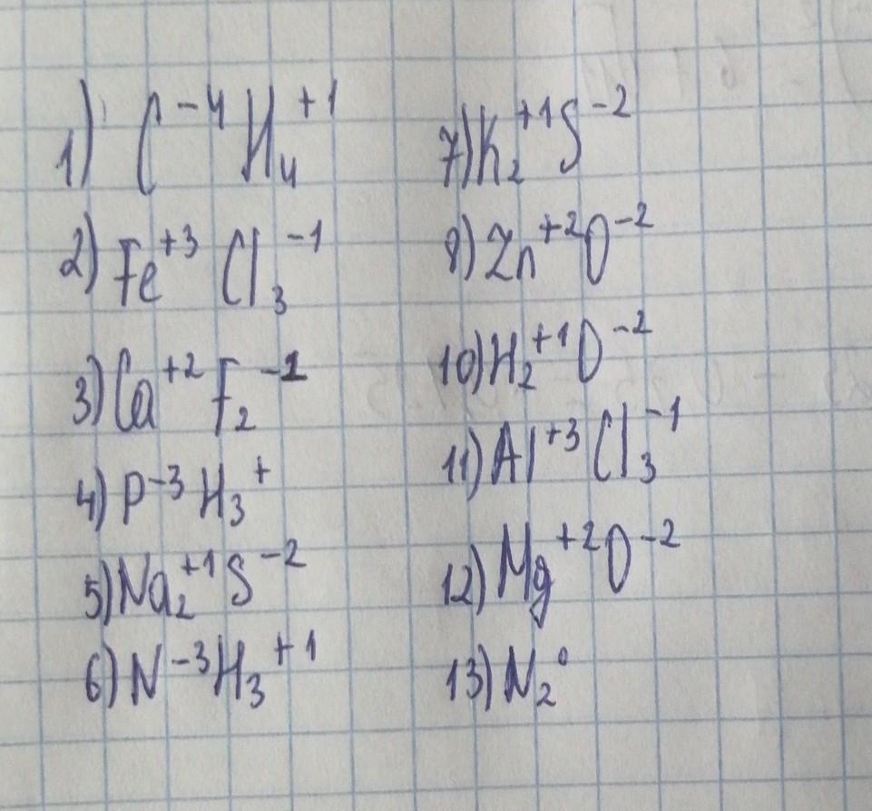 Определите степень окисления каждого элемента в формуле: CH⁴, FeCl³, CaF², PH³, Na²S, SO², NH³, K²S, ZnO, H²O, AlCl³, MgO, N².