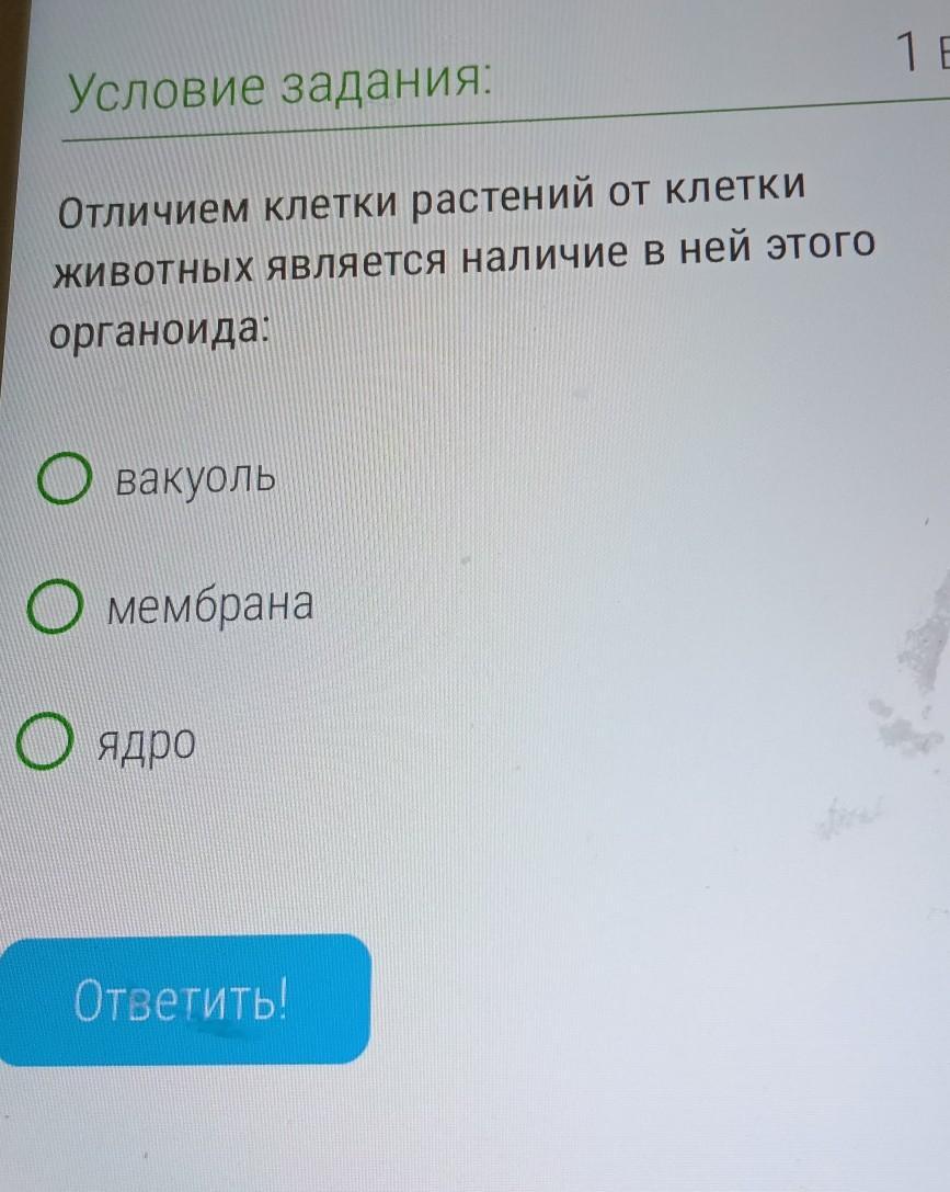 в клетке растений есть вакуоль, а в клетке животных она отсутствует