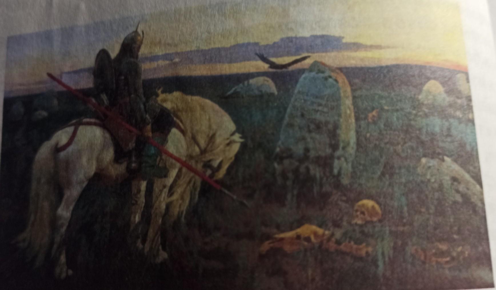 Виктор Михайлович, создав картину "Витязь на распутье" , лишний раз подчеркнул значимость русского фольклора. Перед нашими глазами предстал образ витязя на белом коне, который остановился в раздумьях перед камнем-вещуном. Ворон, череп, кости - все это лишь усиливает волнующее настроение. Палитра красок, которую выбрал художник как бы показывает нам всю тяжесть события, изображённого на холсте. Лишь закат, который виден издалека даёт надежду на то, что где-то там за дорогой богатыря ждёт что-то светлое. От картины веет угрюмостью, мрачностью и темнотой, что зрителю даже через холст передается страх. Богатыри внесли немалый вклад в историю, поэтому всякий раз их заслуги художники стараются запечатлеть в своих работах.