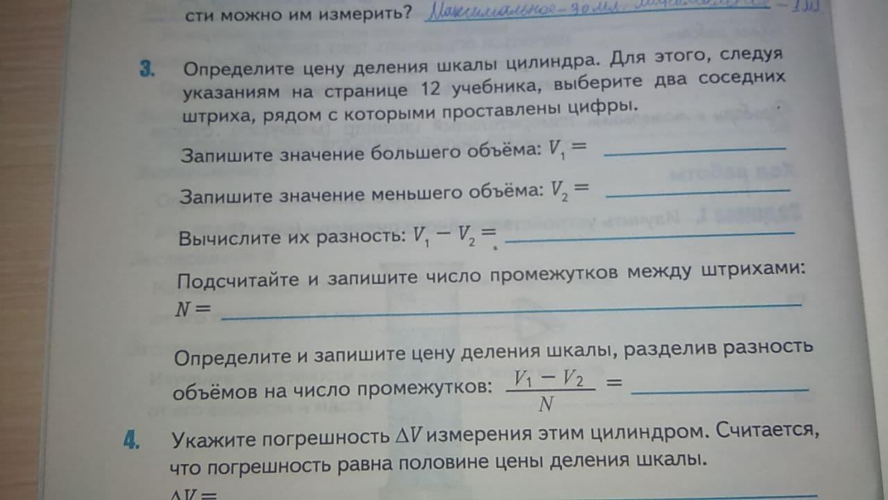 Объяснение: цена деления : берёте два любых числа шкалы цилиндра, например 40 и 50, считаете между ними сколько палочек, палочку где 40 считаете,а где 50 нет,их получается 10,иногда 5,2