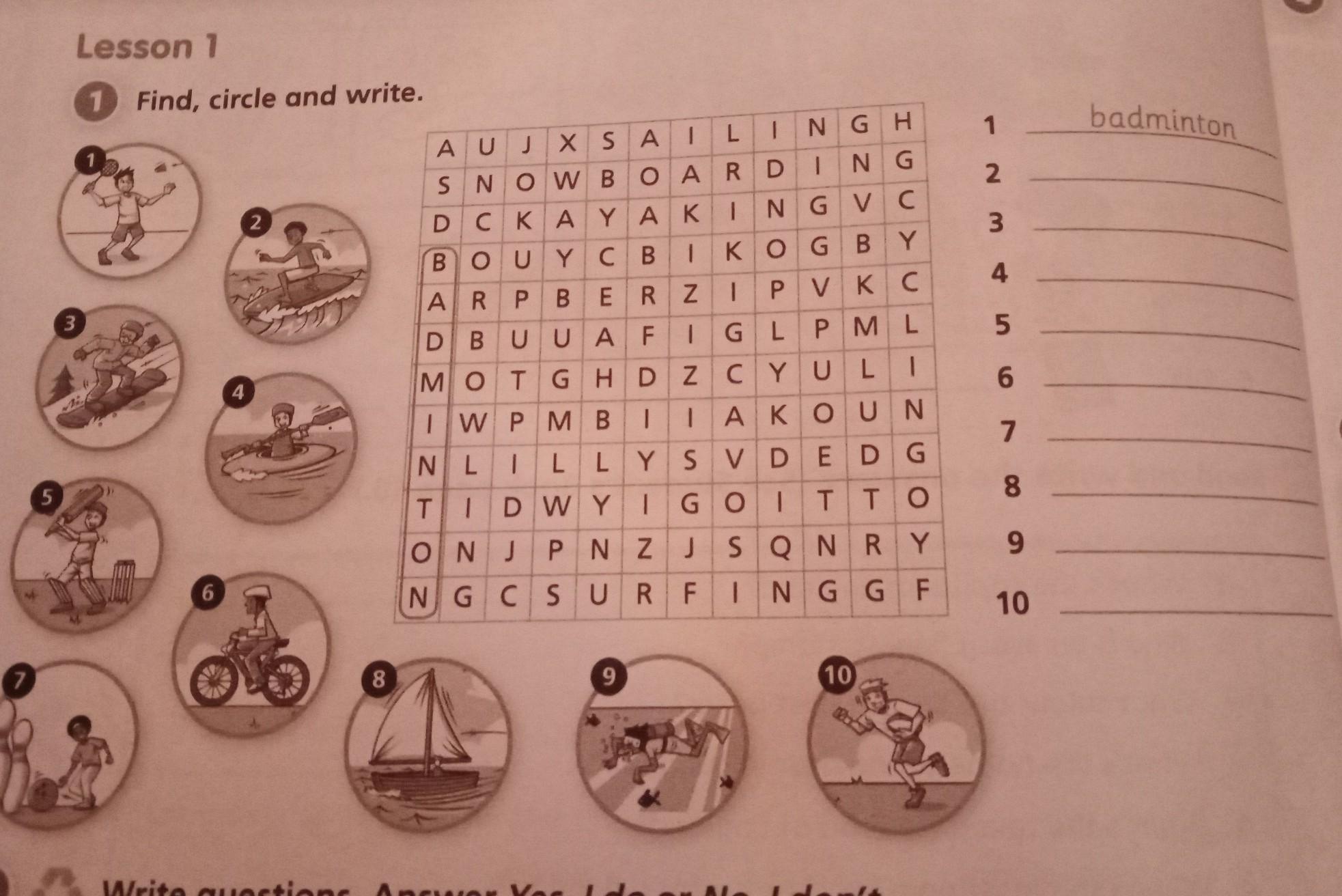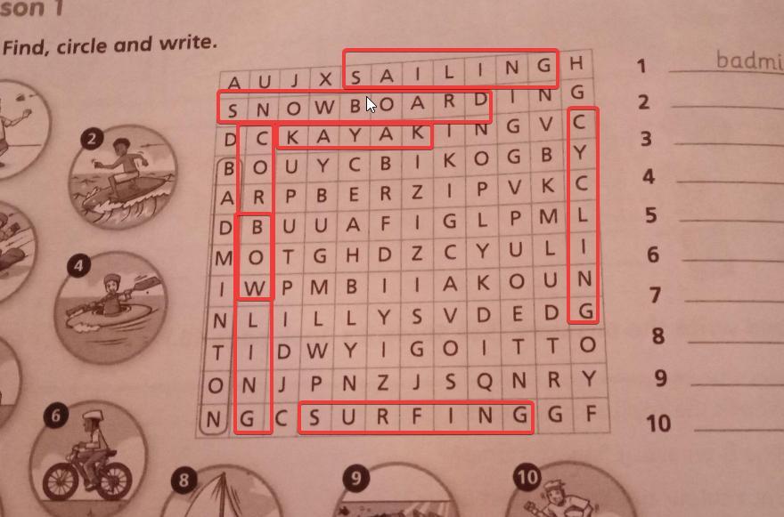 Find, circle and write. A U J Х S 1 N G A IL NG 1 S NO W B Ο Α A R D 2 D СКА Υ Α. AK I U U U 1 N G V C 0 UY U C C B B 1 K OG GB Y AR P. B E R N Трукс 3 D B U U A F 1 GL P M L 4 MO TG HDZ CIYLU L 1 TWP P MB 1 A K O U N NL 1 L L Y S V D E D G 5 T 1 D W Y 1 GO T ΤΟ ON J 6 PNZ J S Q N R Y S U RF 1 N G G G GF N G C