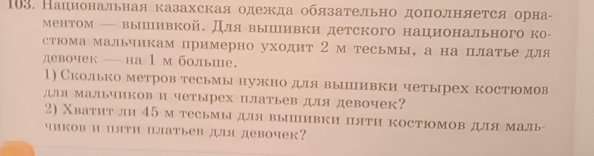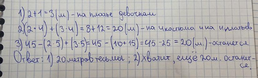 1)2×5+3×5=25(м)-для 5 костюмов и 5 платьев.