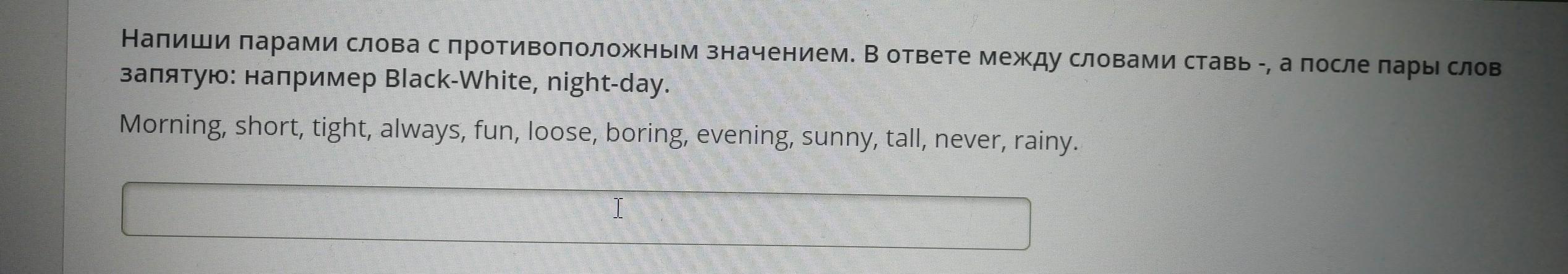 Morning-Evening (утро-вечер), shor—tall (низкий-высокий), always-never (всегда-никогда), fun-boring(веселый-скучный),loose-tight (свободный-узкий), sunny-rainy (солнечно-дождливо)