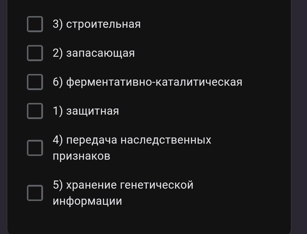Выберите три верных ответа из шести и запишите цифры, под которыми они указаны. Функциями белков в организме человека являются *