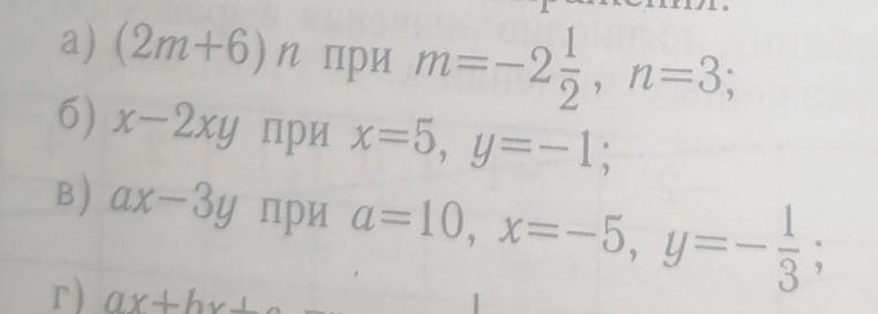 а) (2m +6)n при m=-2, n=3; б) x-2ху при х=5, y=-1; в) ax-3y при а=10, x=-5, y= -- 3