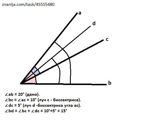 Помогите,пожалуйста,решить задачу.Луч с-биссектриса угла аb.Луч d-биссектриса угла ас.Найдите угол bd,если угол аb=20 градусов.