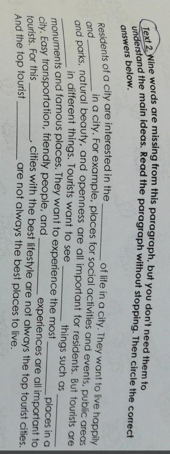 Золотце моё, если тебе учитель сказал сделать то, что ты просишь, шли его нафиг. Суть задания написана в конце: "потом обведи правильные ответы ниже". Слова пропущены, чтобы ты вникал в тот текст и примерно дополнял пропущеные слова. Если всё-таки с учителем не повезло, доказывай правоту