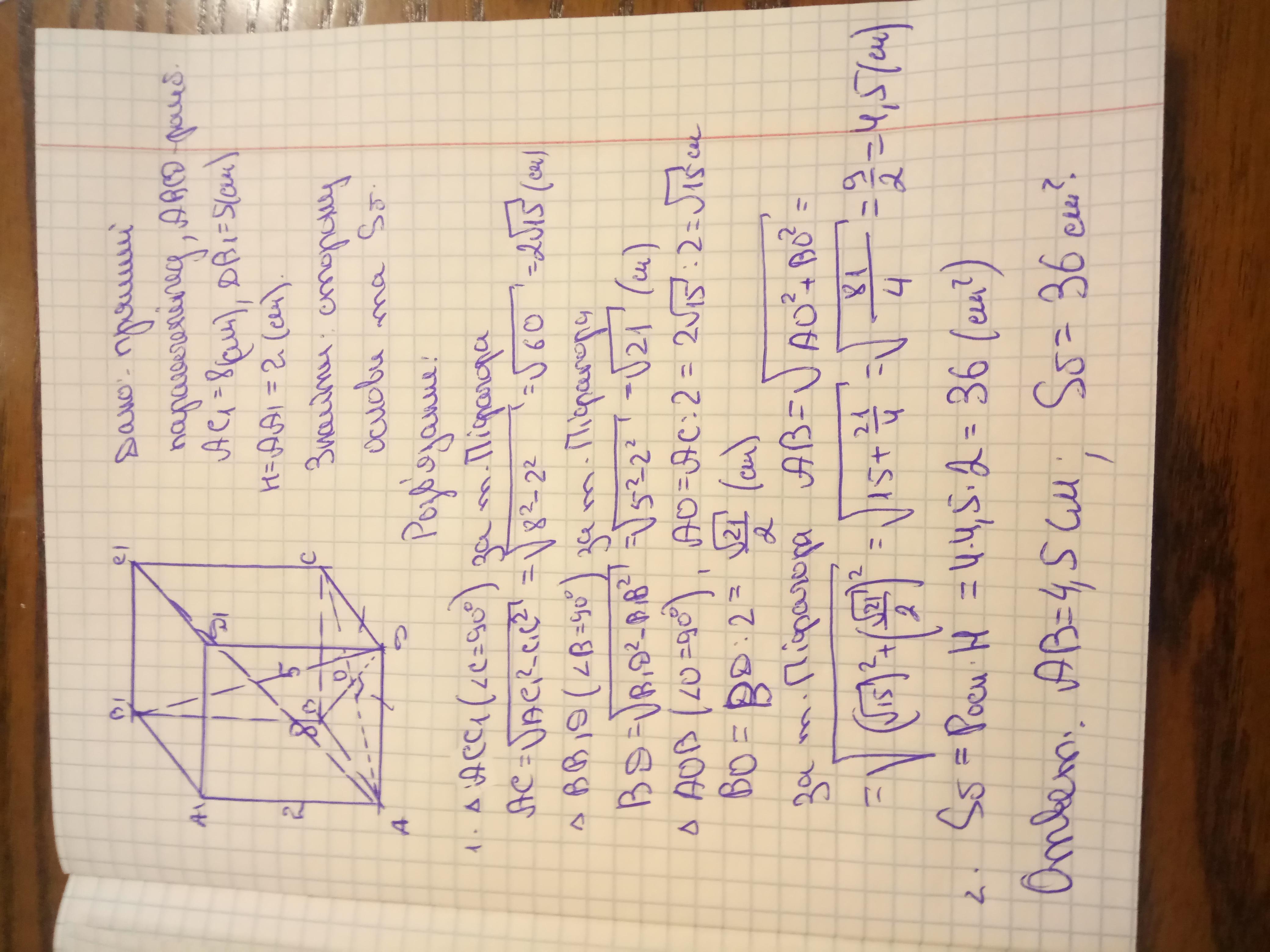 За умовою дiагоналi 5 та 8. Тодi це прямий паралелепiпед. Розв'язання на фото.