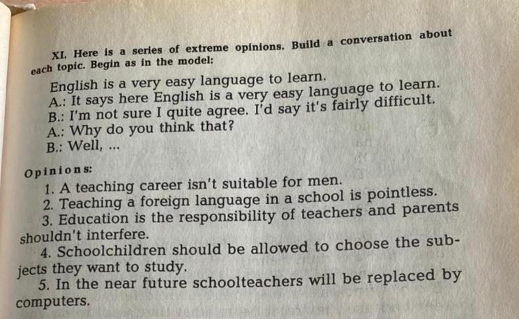 XI. Here is a series of extreme opinions. Build a conversation about