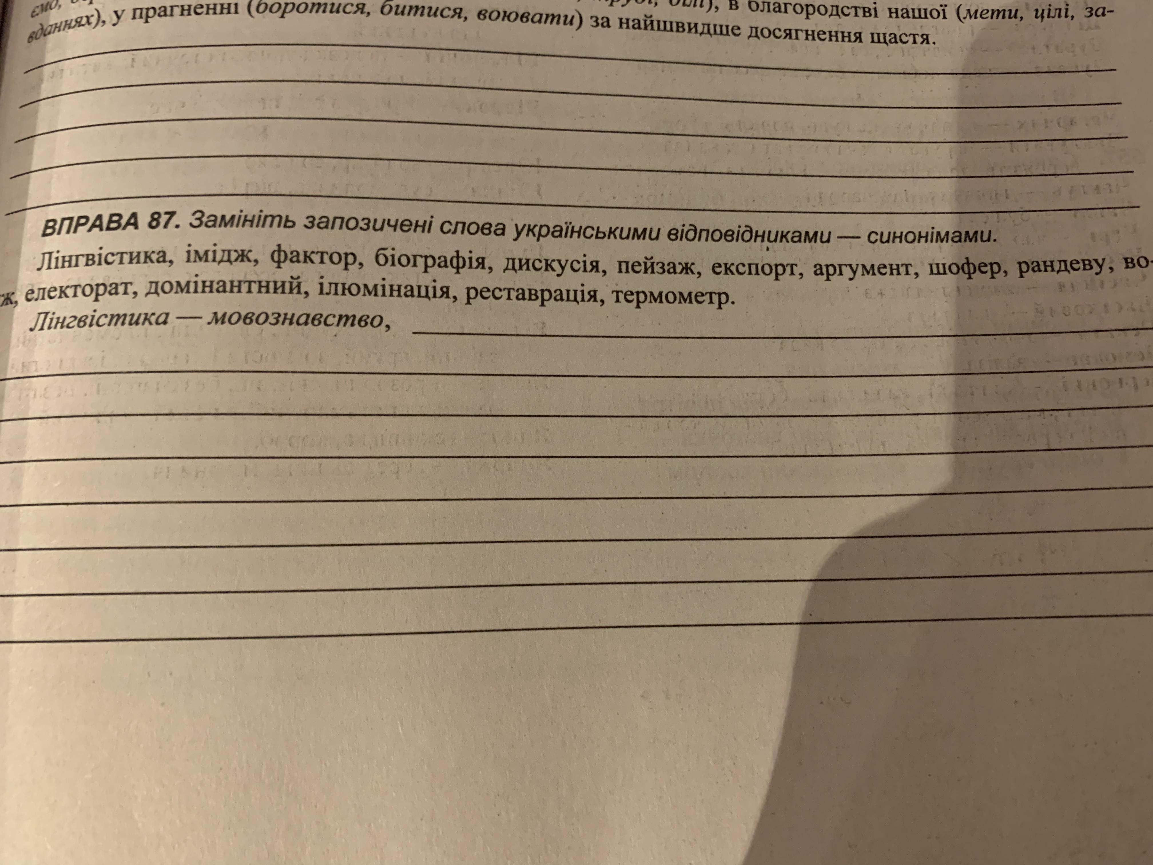 Імідж - репутація, фактор - чинник, біографія - життєпис, дискусія - обговорення, пейзаж - краєвид, експорт - вивіз, аргумент - доказ, шофер - водій, рандеву - зустріч/побачення, вояж - подорож, електорат - виборець, домінантний - панівний/головний, ілюмінація - освітлення, реставрація - відновлення, термометр - тепломір/градусник.