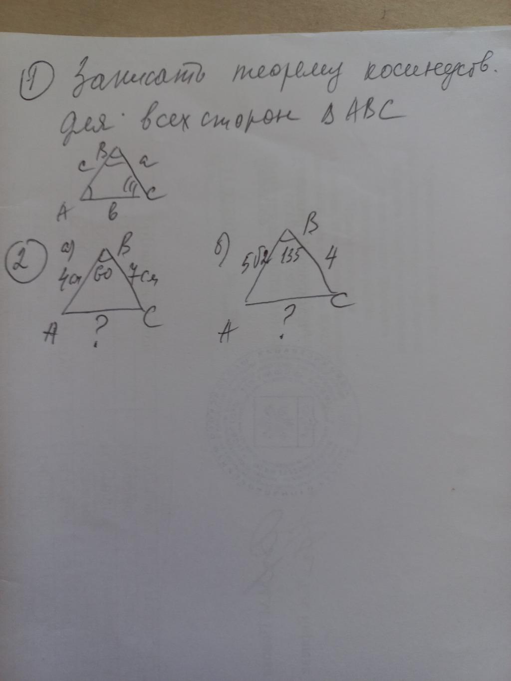#1. Не понимаю о какой теорме идет речь, но проведи медиану=высоту=расстояние к АС (выбирай что удобнее), так как геометричесике тождества (косинусы, синусы и тд) получаются только при прямоугольном треугольнике. И назоми ее М.