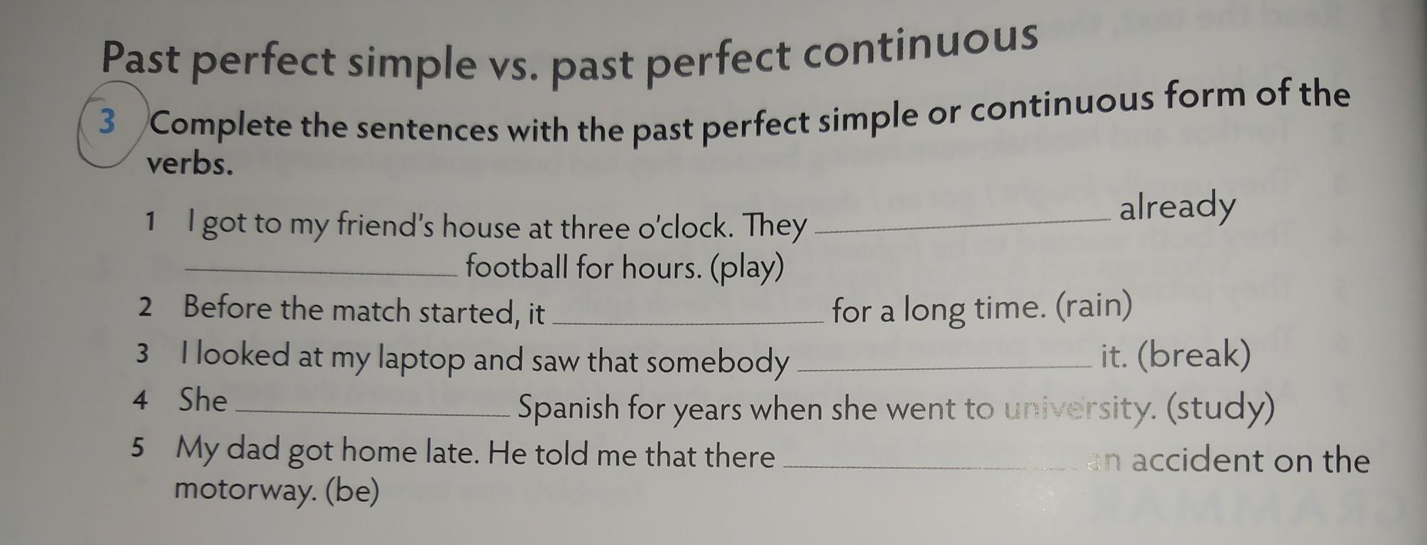 Past perfect simple vs. past perfect continuous complete the sentences with the past perfect simple or continuous form of the verbs. already 1 I got to my friend's house at three o'clock. They football for hours. (play) 2 Before the match started, it for a long time. (rain) it. (break) Spanish for years when she went to university. (study) an accident on the 3 I looked at my laptop and saw that somebody 4 She 5 My dad got home late. He told me that there motorway. (be)