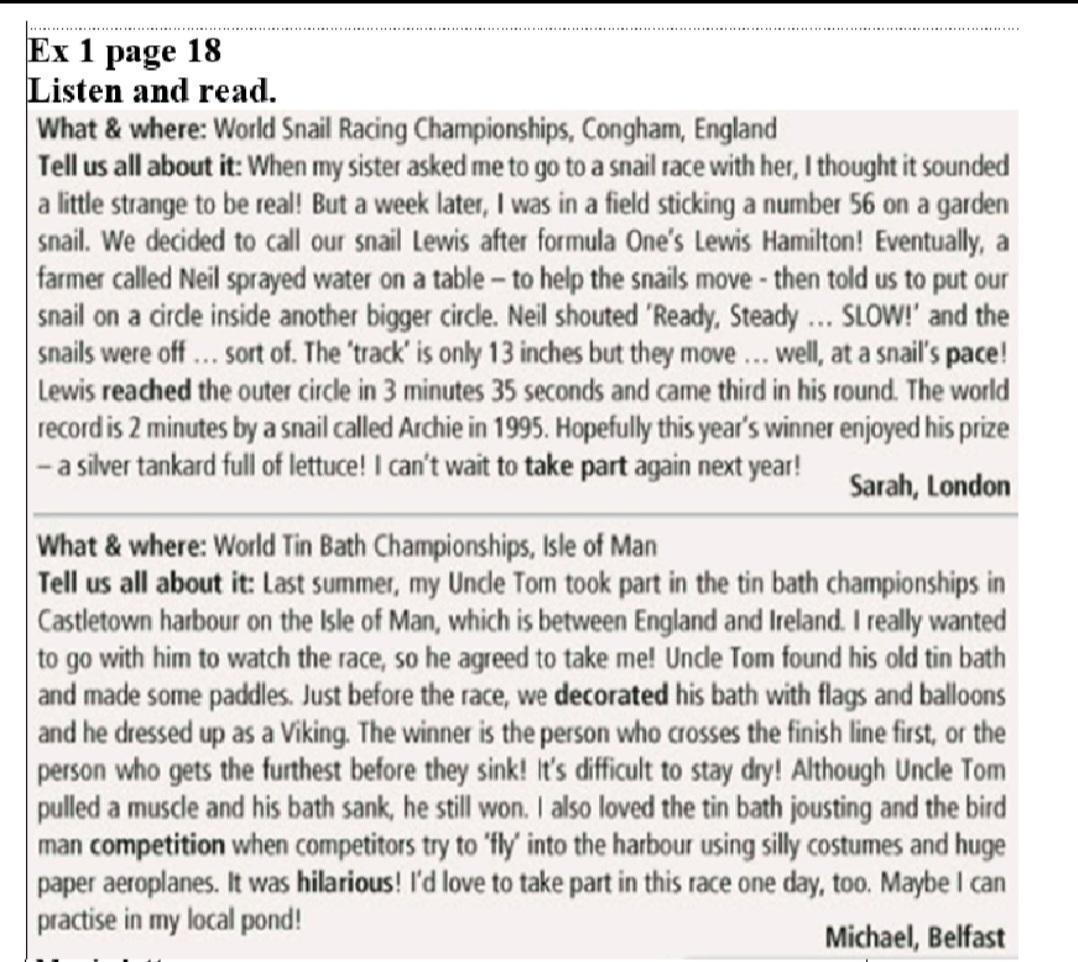 2. 9.4.2.1 9.5.8.1 Read again and complete the sentences with a word or phrase from the text. 1 Neil sprays water on the table because he wants to 2 The snail race track is ..... long. 3 The winner of the snail racing championship won 4 Uncle Tom put on clothes to look like a(n) 5 During the tin bath race it's hard to ....