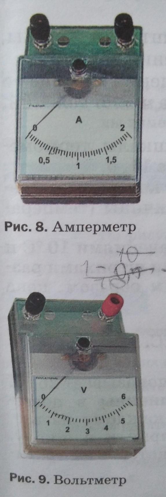 У амперметра - мелкое деление 0,05А, крупное 0,1 А. У вольтметра 0,2 В