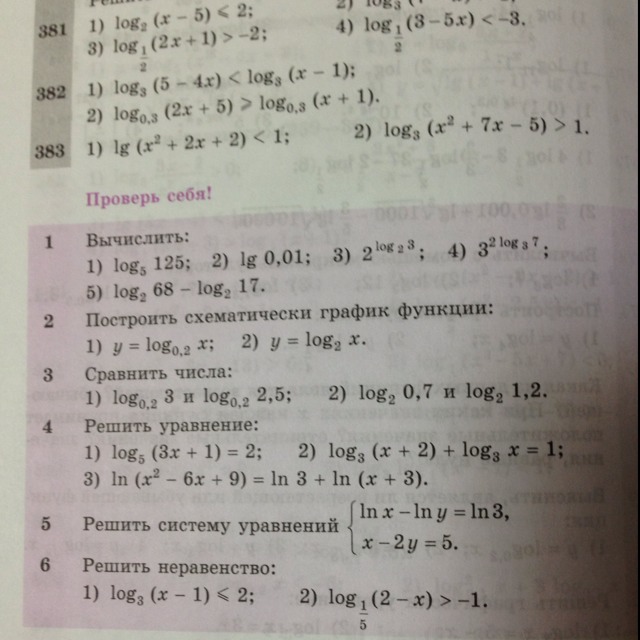 1) 5^x=125; 5^x=5^3; x=3. 2)10^x=0,01; 10^x=10^(-2); x=-2. 3)2^(log2_3)=3. 4)=3^(log3_49)=49. 5)=log2_(68/17)=log2_4=2. Сравнить числа log0,2_31). Уравнения 1) 3x+1=5^2; 3x+1=25; 3x=24; x=8. 2) log3_(x*(x+2))=1; log3_(x^2+2x)=log3_3; x^2+2x=3; x^2+2x-3=0; x=1; x=-3. Одз x>0 Корень х=-3 не подходит по одз . Ответ х=1 3)x^2-6x+9=3(x+3); x^2-6x+9-3x-9=0; x^2-6x+18=0; x1=6;x2=3. по Одз х не равен 3, тогда остается корень х=6. Можно просто проверить подстановкой.