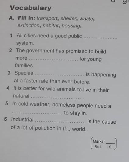 A. fill in: transport, sheller, waste, extinction, habitat, housing. 1 all cities need a good public … system. the government has promised to build more … … families. species … … is happening at a faster rate than ever before. it is better for wild animals to live in their natural … 5 in cold weather, homeless people need a … … 6 industrial … … to stay in. of a lot of pollution in the world. for young … is the cause
