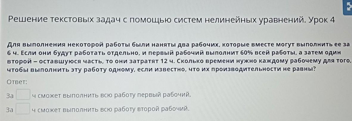 Ответ: время выполнения всей работы первым рабочим 10 часов,