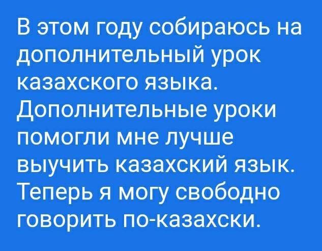 Мына жылы біз казак тілінен косымша сабакка жиналып жатырмыз.Маған қосымша сабақтары қазақша сөйлеуге көмектесті.Енді мен қазақша бос сөйлей аламын.