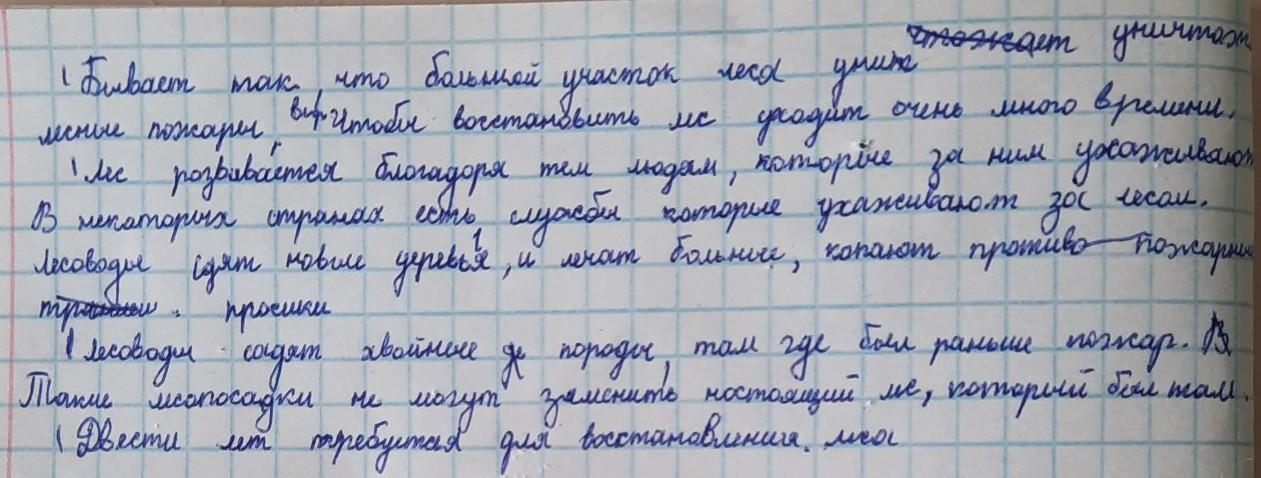 Ответ: Бывает так что большой участок леса уничтожает лесные пожары, чтобы восстановить лес, уходит очень много времени.