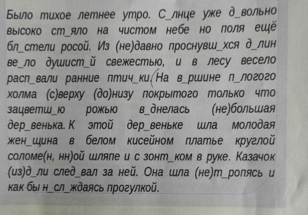 Солнце уже довольно высоко стояло на чистом небе но поля ещё блестели росой . Из Недавно проснувшихся долин ве? ло душистой свежестью , и в лесу весело распевали ранние птич?ки (На вершине пологого холма сверху донизу покрытого только что зацветш?ю рожью виднелась не? большая деревенька .К этой деревеньке шла молодая женщина в белом кисейном платье круглой соломенной шляпе и с зонтиком в руке.Казачок из дали следовал за ней .Она шла не торопясь и как бы наслаждаясь прогулкой.