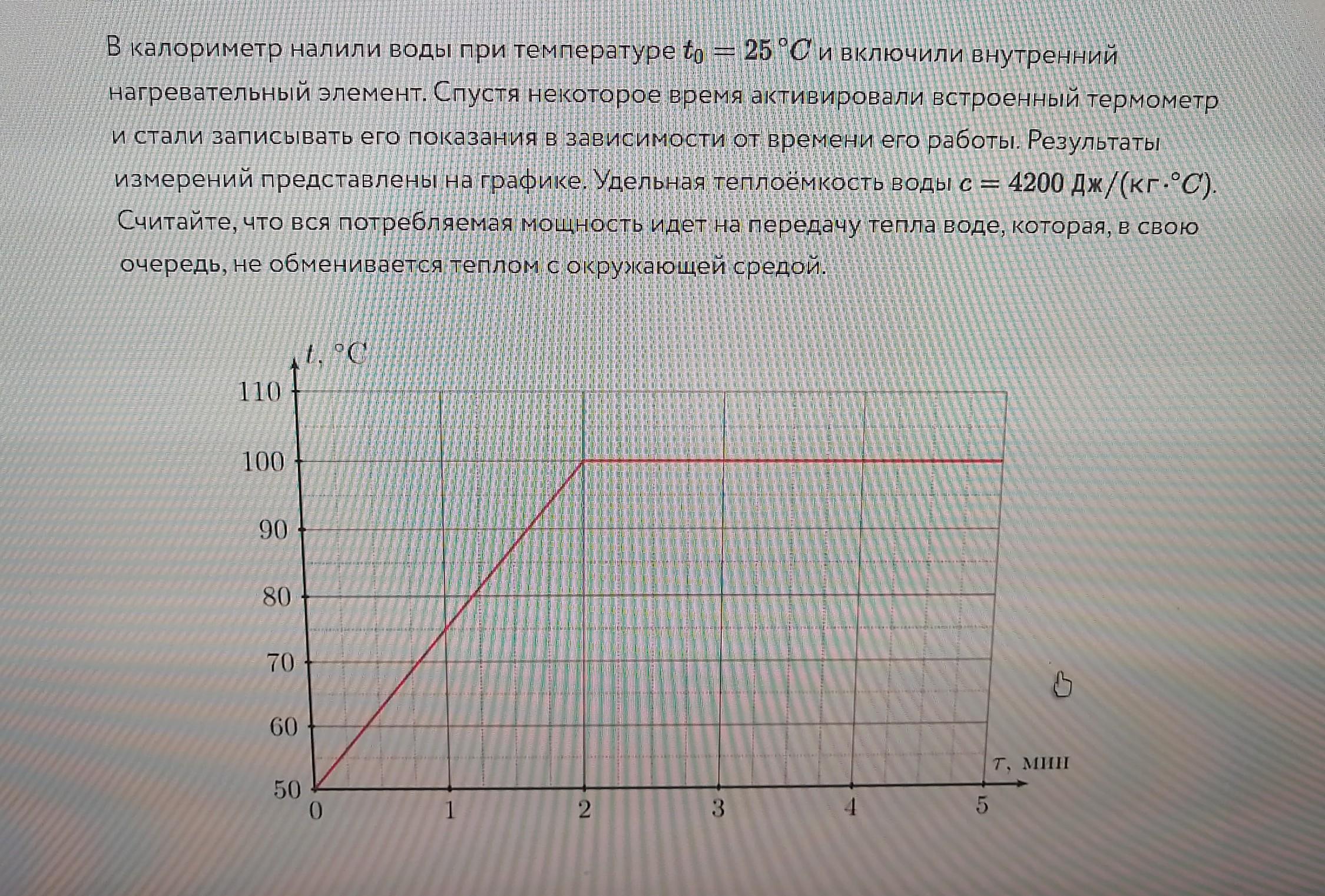 2. Считая мощность нагреватель неизвестной, но постоянной, определите отношение этой мощности к теплоёмкости содержимого калориметре до начала кипения. Ответ выразите в СИ (система интернациональная), округлив до сотых