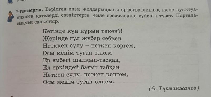 - 7-тапсырма. Берілген өлең жолдарындағы орфографиялық және пунктуа- циялық қателерді сөздіктерге, емле ережелеріне сүйеніп түзет. Партала- сыңмен салыстыр. Көгінде күн нұрын төкен?! Жерінде гүл жұбар себкен Нетккен сұлу неткен көргем, Осы менім туған өлкем Ер ембегі шалқып-тасқан, Ел еркіңдей бағыт табқан Неткен сулу, неткен көргем, Осы менім туған өлкем. (Ө. Тұрманжанов)