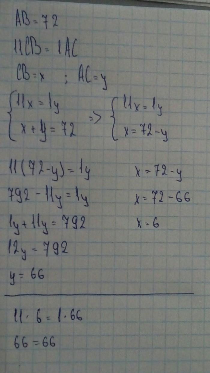 Вычисли длины частей отрезка, если 1CB=11AC.