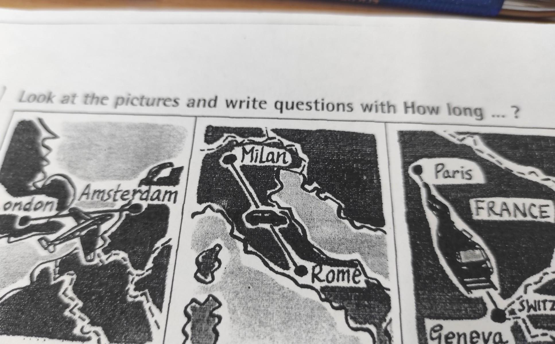 Look at the pictures and write questions with How long Milan Amsterdam London Rome