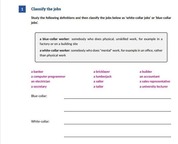White-collar: a banker, a computer programmer, a secretary, an accountant, a sales representative, a university lecturer